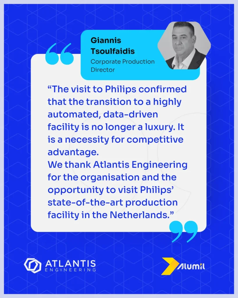 “As a large company in the aluminium extrusion sector with many different processes and production lines, we are constantly looking for the point where efficiency meets quality. The visit to Philips confirmed that the transition to a highly automated, data-driven facility is no longer a luxury. It is a necessity for competitive advantage. We thank Atlantis Engineering for the organisation and the opportunity to visit Philips’ state-of-the-art production facility in the Netherlands.”